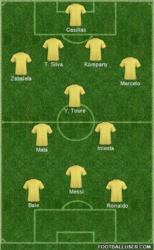 My team: GK: Casillas RB: Dani Alves CB: Terry CB: Pique LB: Alaba MF: Fabregas LM: Bale RM: Xavi ST: Ronaldo CF: Messi ST: Falcao Subs:Lloris Aguero Iniesta Ribery Ramos Benzema Rooney Formation: 3-3-4 Attacking style: Aggressive Defending style: Balanced