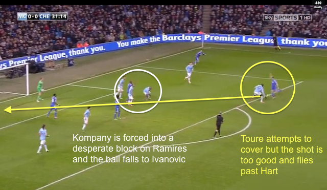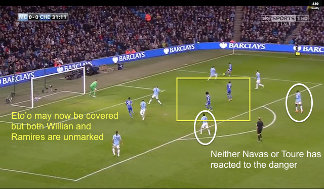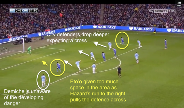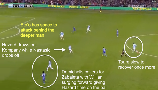With Toure far from determined to recover his position, though, the result is that Eden Hazard is given plentiful room in front of the defence to pick a pass and should have played in Eto'o given the space created behind Kompany, who had been drawn to the ball.