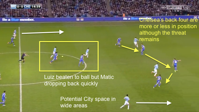 Toure gets past Luiz, while both Jesus Navas and Aleksandar Kolarov are making strong runs down the side for City. The Chelsea back four, though, is already well positioned to defend the attack. Matic, too, is making good ground to cover.