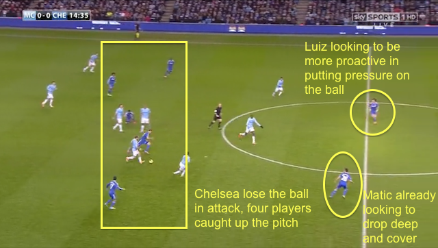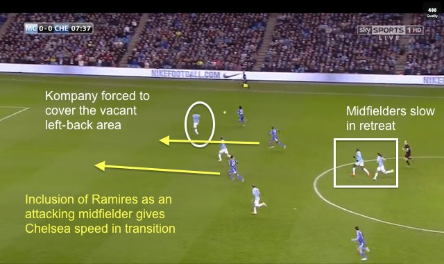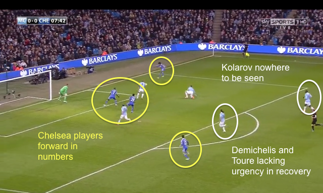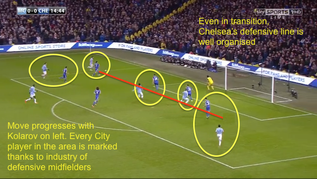 The move ultimately led to a corner, after a collision between Vincent Kompany and Nemanja Nastasic almost presented Chelsea with a golden chance. The lack of organisation, though, was caused by their opponent s speed in transition.