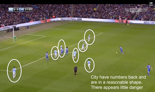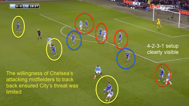 A big part of that was the role of Hazard, Willian and Ramires, all of whom were excellent at tracking back and watching runners from midfield. As the following picture demonstrates, their industry enabled Chelsea to keep their shape in the face of City's spells of possession.