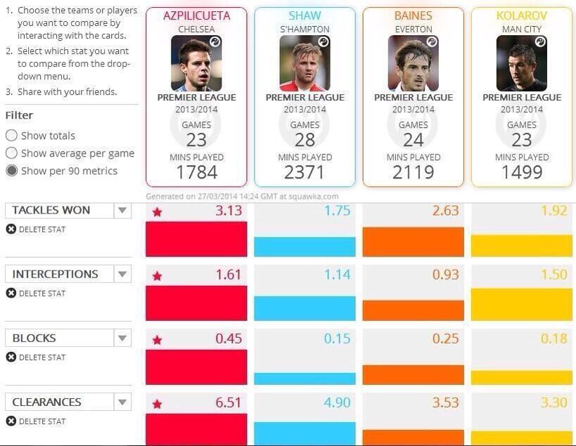 Hmm this is fascinating. But it doesn't really say much about Azpilicueta as a full-back. The greatest full-backs in the world are known for their contribution going forward as well as defense. They are balanced in a sense. And the stats you provided are very narrow and only show the defensive side of the game. Azpilicueta fits well into Mourinho's style of play, but he wouldn't be able to get into any other top side in Europe. Here are some left-backs aged 25 and lower. I added different stats, mainly attacking wise. I know who'd I want on my team. BTW thanks for introducing us to this website!