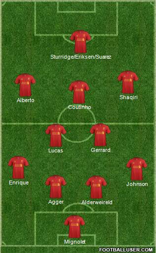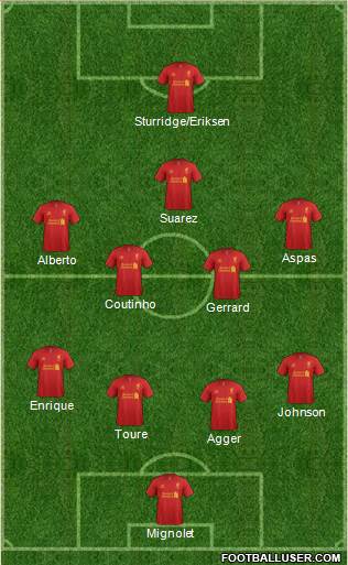 FORMATION 1) Would be more of an attacking formation, with Suarez and Eriksen/Sturridge linking up and Coutinho and Gerrard controlling the midfield, with possible through balls to Suarez and Sturridge/Eriksen. Enrique and and Johnson would at times, be able to run of the sides and possibly cross it into the box or pass it to either Aspas or Luis Alberto. The Gerrard-Suarez partnership and Suarez-Sturridge partnership have already been proven to work effectively and can only get better in time! Toure or Alderweireld could play alongside Agger.