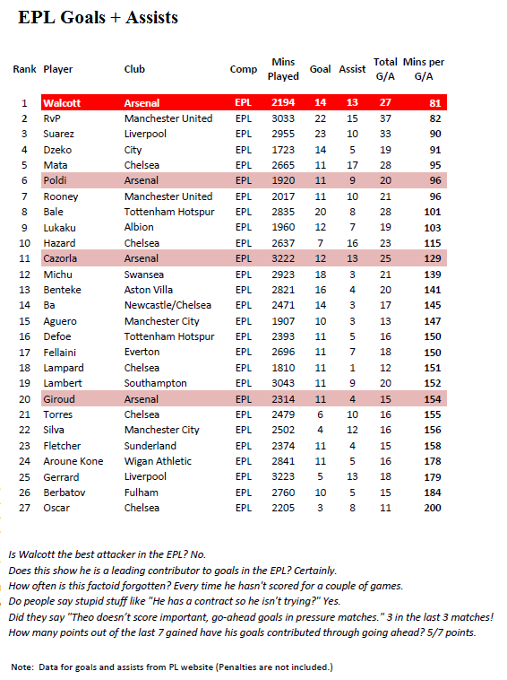 The other day I had a discussion with someone who was of the opinion that Walcott is not a good player. Then I came across this table and I thought I'd share it as it may help to change people's minds. I think it shows that he is truly growing into a quality player.