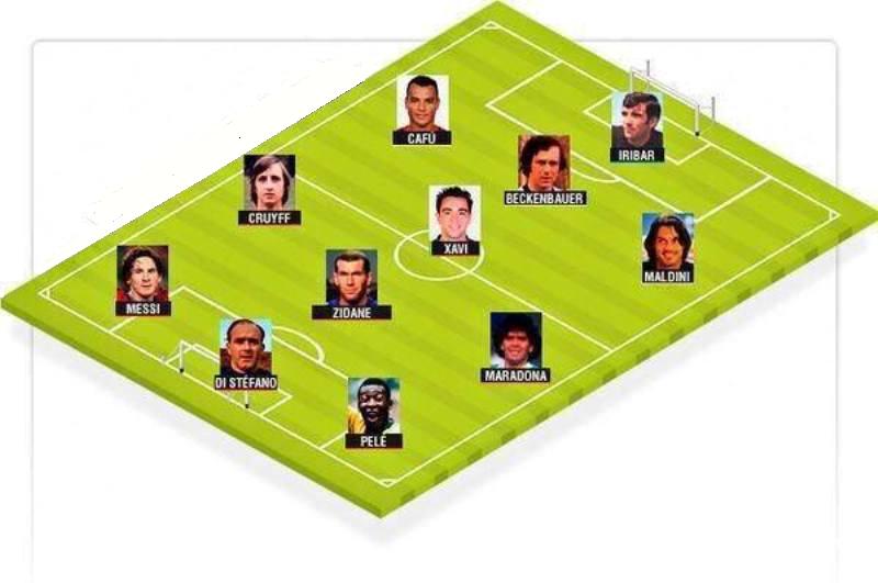 GK is great, defence with Beckenbauer, Maldini and Cafu is almost unbreakable. Cruyff and Maradona are deadly combination, with Zidane as AMF. Di Stefano and Messi with Pele. What an attack! Yeah, respect that he didn't put himself in XI. Would be great if CR7 could be there also. But this is freaking amazing...